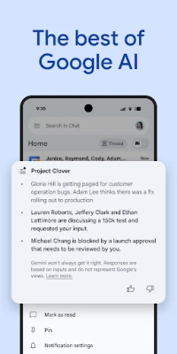 گوگل چیٹ، جو گوگل کی جانب سے پیش کردہ ہے، مصنوعی ذہانت (AI) کی جدید صلاحیتوں سے آراستہ ہو کر ٹیم ورک اور پیغام رسانی کے انداز کو مکمل طور پر تبدیل کرتا ہے۔ جیمنائی کی طاقت سے لیس یہ پلیٹ فارم آپ کی گفتگو کو نہ صرف سمجھتا ہے بلکہ اسے مزید کارآمد بناتا ہے۔ طویل بات چیت کا فوری خلاصہ حاصل کریں تاکہ آپ ہمیشہ باخبر رہیں۔ 120 سے زیادہ زبانوں میں پیغامات کا خودکار ترجمہ کریں، جو عالمی ٹیموں کے لیے رابطے کو ہموار کرتا ہے۔ AI کی مدد سے اپنی مطلوبہ معلومات کو تیزی سے تلاش کریں، اور اہم عملی نکات کو نمایاں کر کے ہر رکن کو ایک ہی صفحے پر رکھیں تاکہ کوئی بھی کام ادھورا نہ رہے۔