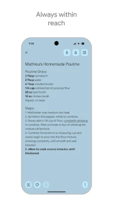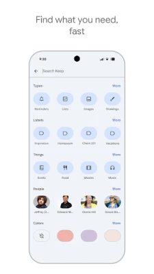 اپنی زندگی کو منظم اور سہل بنانے کے لیے، آپ اپنے نوٹس کو رنگوں سے نمایاں کر سکتے ہیں اور لیبلز لگا کر انہیں فوری طور پر ترتیب دے سکتے ہیں۔ اگر آپ کو کبھی کسی محفوظ شدہ معلومات کی ضرورت ہو، تو ایک سادہ تلاش کے ذریعے اسے پل بھر میں ڈھونڈنا ممکن ہے۔ دوستوں اور خاندان کے افراد کے ساتھ اپنے خیالات کا تبادلہ کریں، چاہے وہ خریداری کی فہرست تیار کرنا ہو یا اگلے سفر کی منصوبہ بندی کرنا ہو—نوٹس کی مشترکہ خصوصیات کے ساتھ باہمی تعاون کا لطف اٹھائیں۔ مزید تیزی سے رسائی کے لیے، اہم نوٹس کو اپنے فون یا ٹیبلٹ کی ہوم اسکرین پر ویجیٹس کے ذریعے پن کریں، یا Wear OS ڈیوائس پر ٹائلز کے ساتھ شارٹ کٹس شامل کریں۔